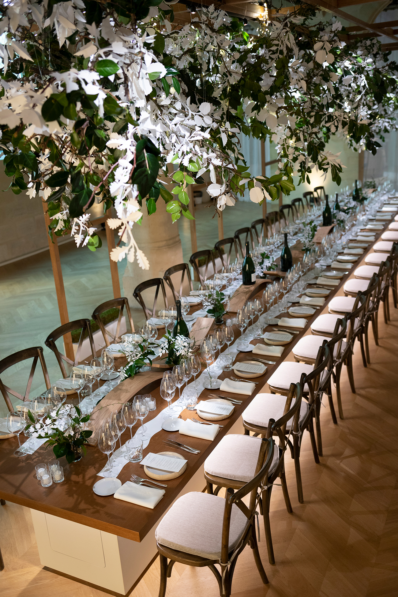 Mise en scène d’une canopée suspendue où se mêlent cinq essences d’arbres, incarnées avec finesse à la fois en papier et en végétal : l’aubépine, le noisetier, le platane, le chêne et le frêne.